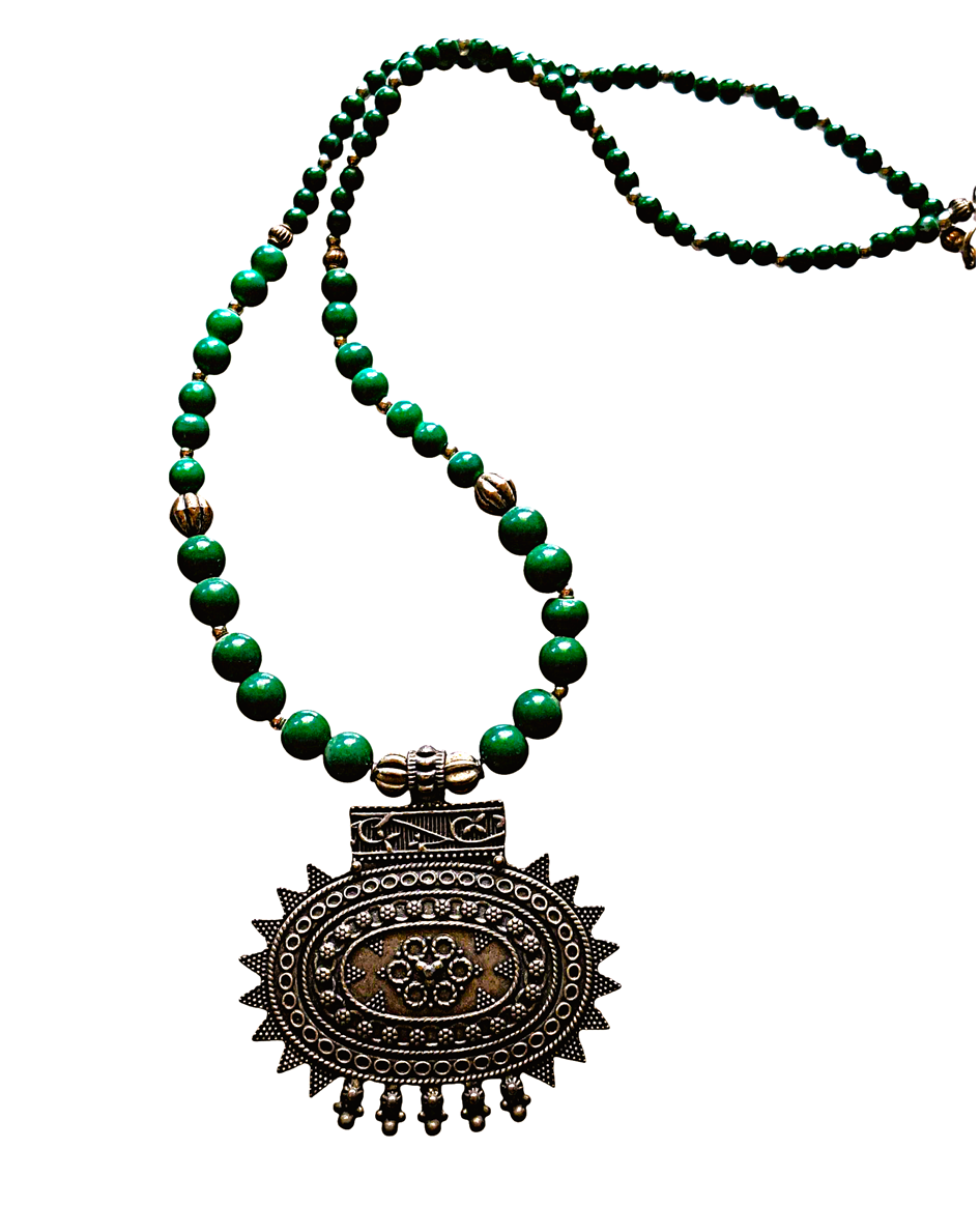 Berberyjski naszyjnik z ręcznie wykonanym wisiorem i zielonymi koralami.