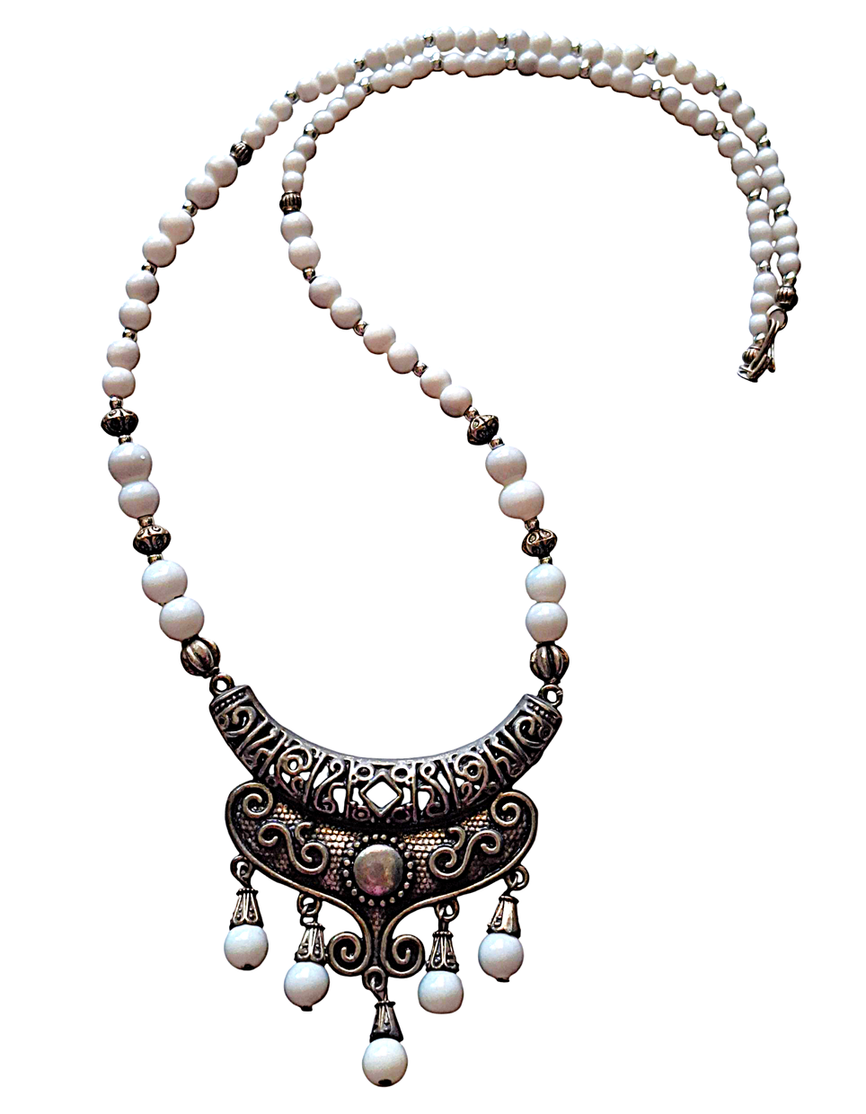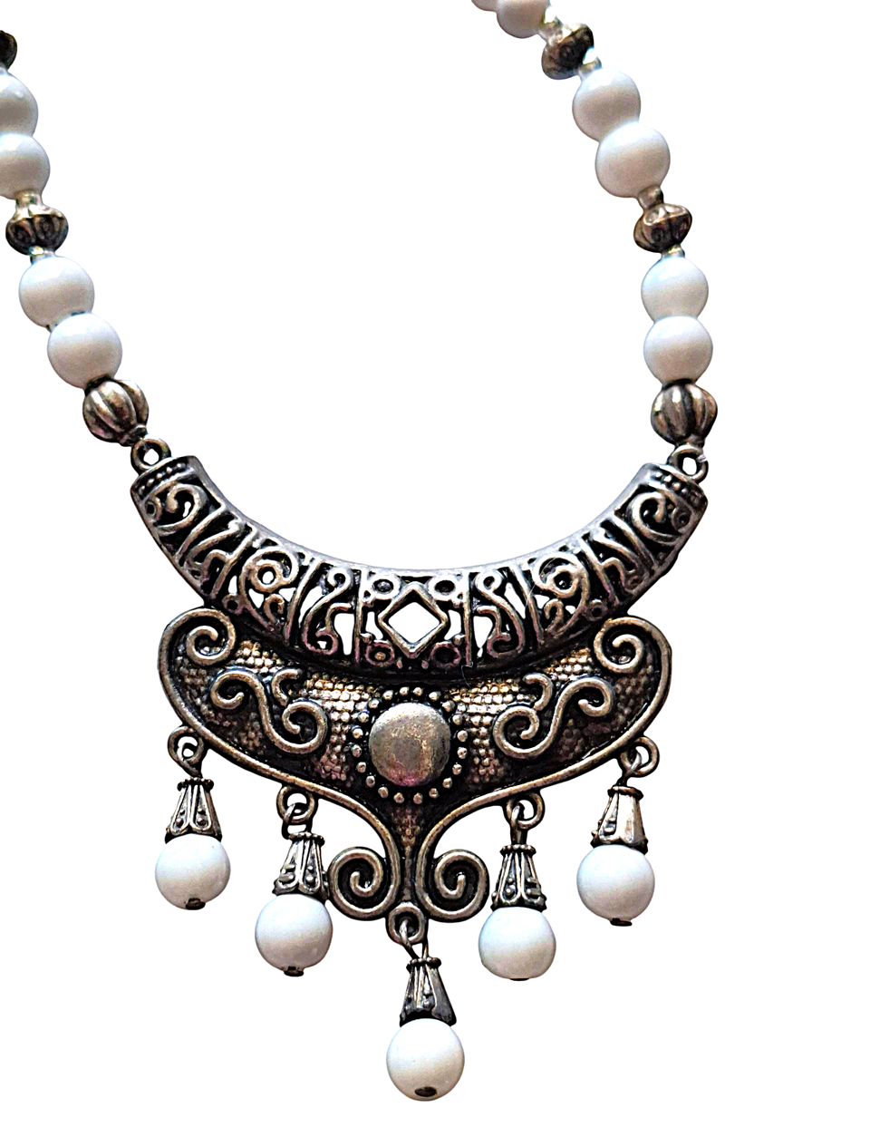 Wisior ozdobiony jest delikatnymi metalowymi dzwoneczkami zakończonymi białymi koralikami, które subtelnie poruszają się przy każdym ruchu, w kulturze berberyjskiej i marokańskiej to typowe zdobienia.