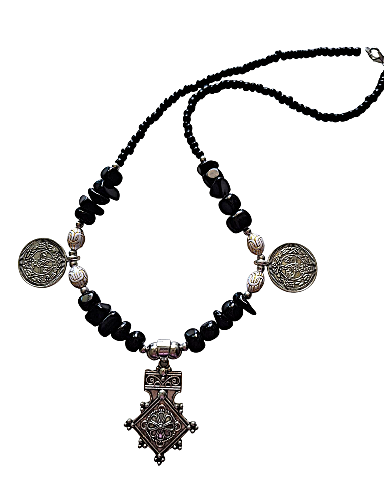 Odkryj wyjątkowy marokański naszyjnik z berberyjskimi akcentami, który zachwyca nie tylko wyglądem, ale i historią zaklętą w każdym detalu. Ręcznie wykonany przez lokalnych rzemieślników z Maroka, jest połączeniem tradycyjnego dziedzictwa plemiennego z nowoczesną elegancją. Naszyjnik zdobią naturalne kamienie starannie dobrane nie tylko ze względu na piękno, ale również ze względu na ich symbolikę.