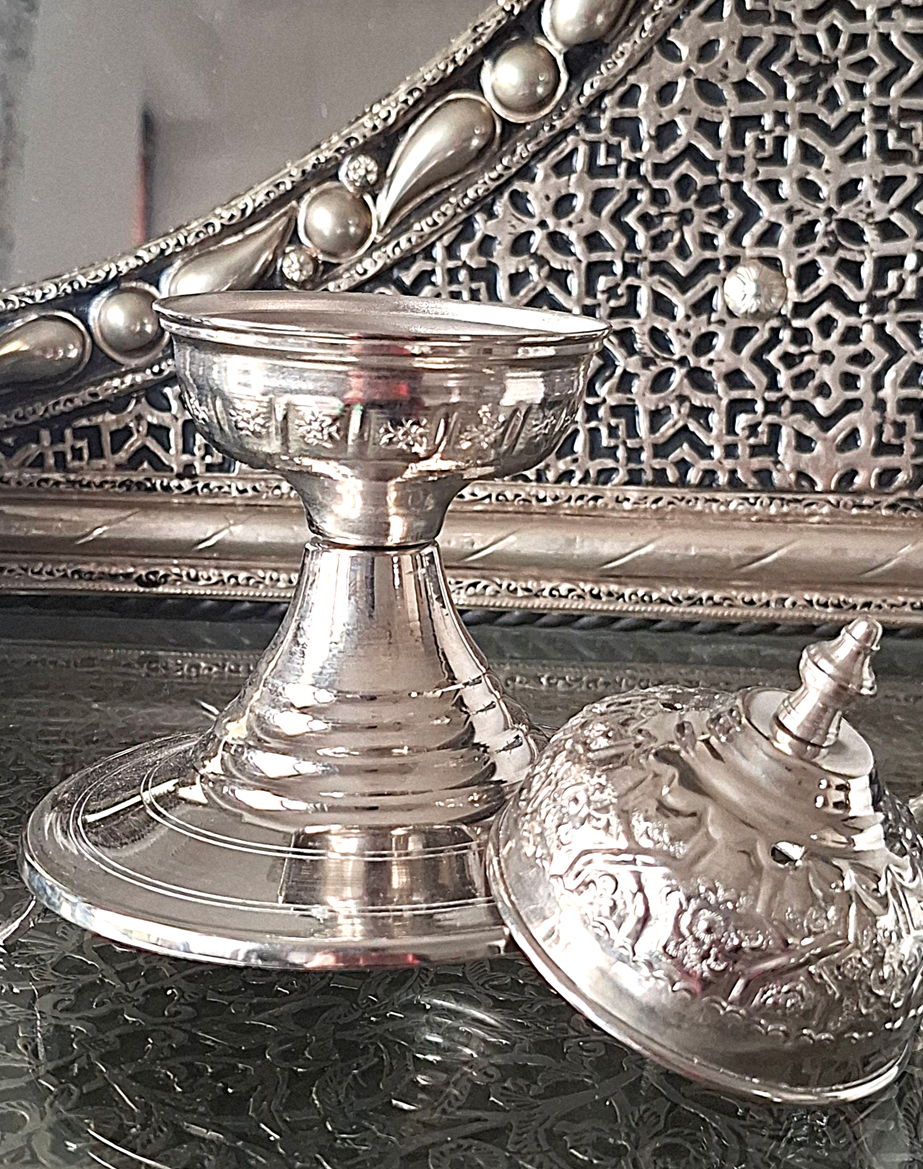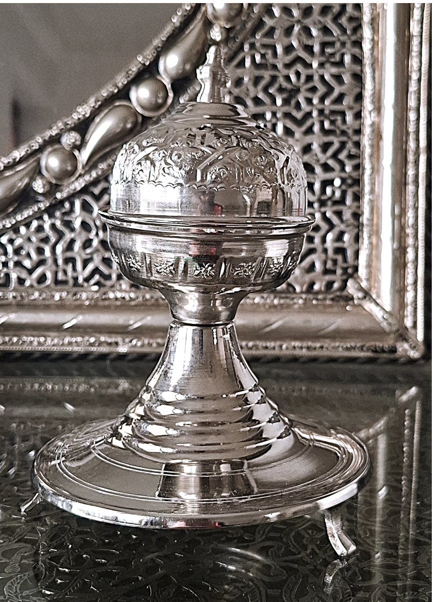 Oto klejnot Orientu, zamknięty w formie wyjątkowej, ręcznie zdobionej kadzielnicy z Maroka – wykonanej w całości z metalu w szlachetnym odcieniu srebra.