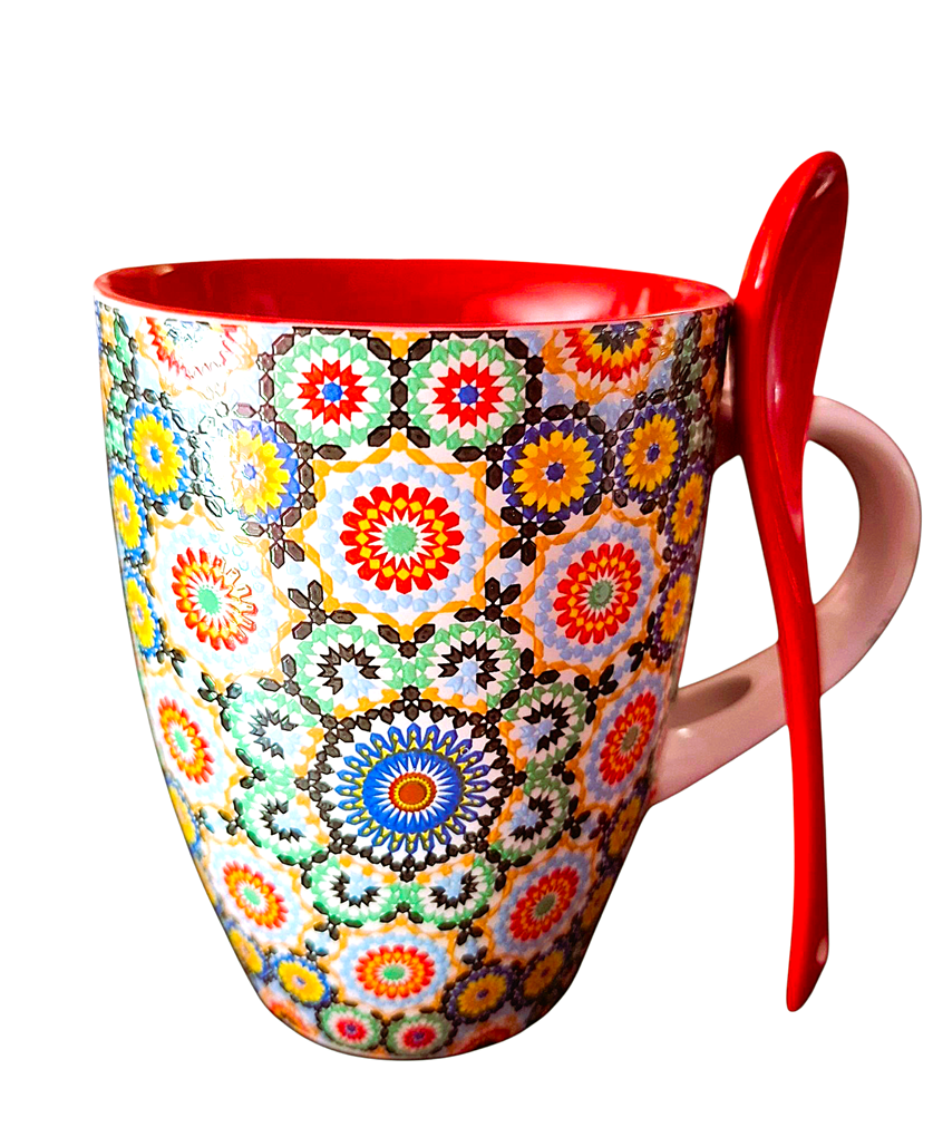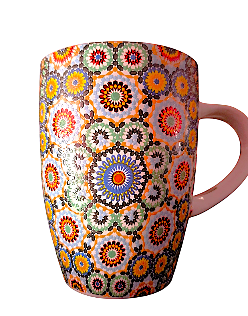 Kubek przyciąga wzrok bogactwem detali – kolorowe rozety i symetryczne wzory tworzą harmonijną kompozycję w odcieniach czerwieni, błękitu, zieleni, pomarańczy i żółci.