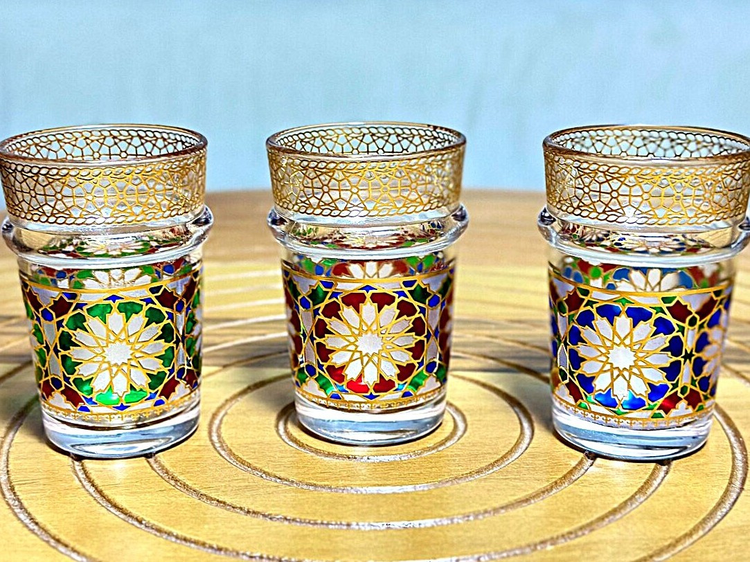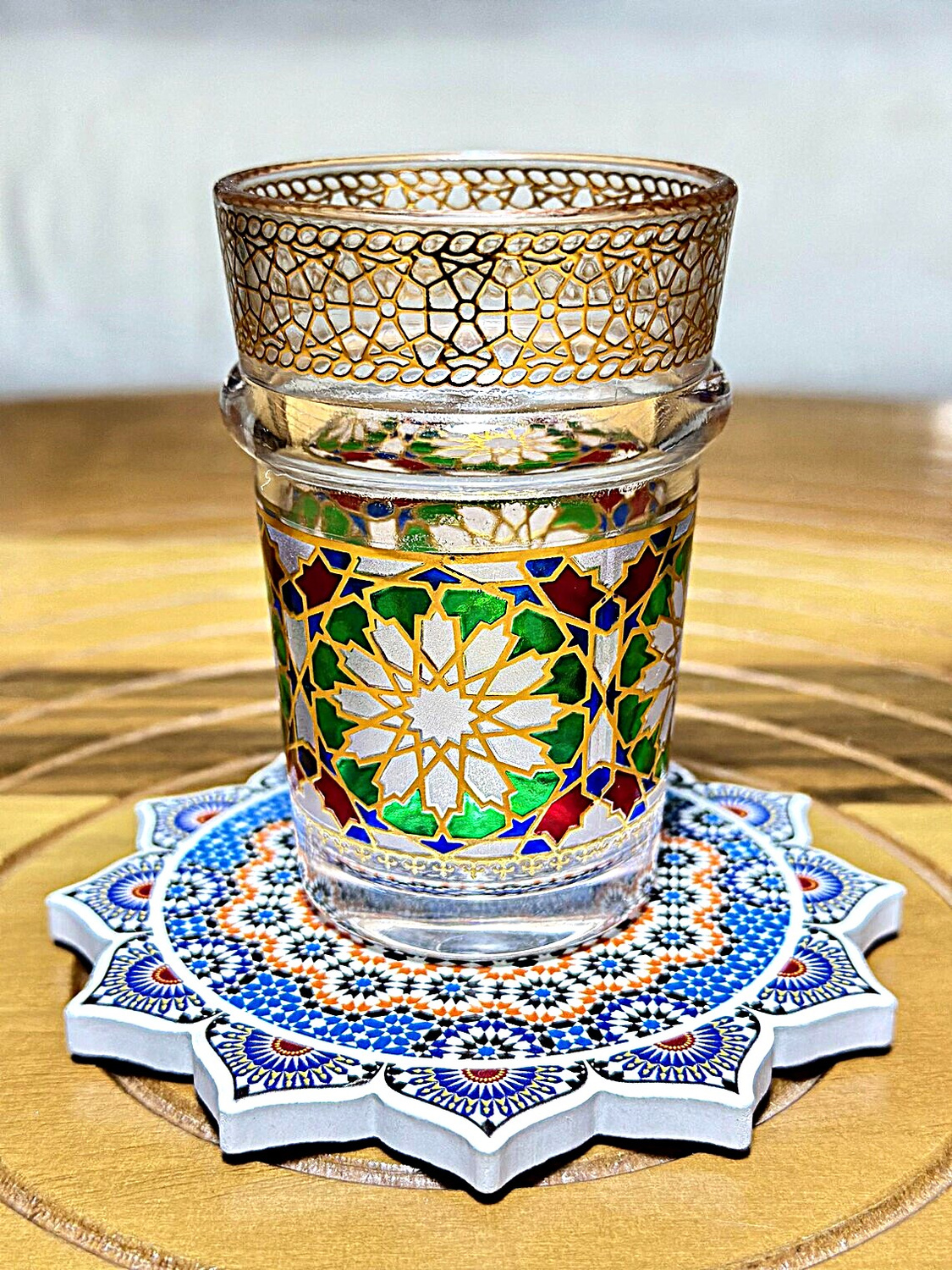 Te szklanki to klasyczne marokańskie szklanki do herbaty, znane ze swojego bogatego i kolorowego wzornictwa, które odzwierciedla sztukę i kulturę Maroka oraz – świata arabskiego.