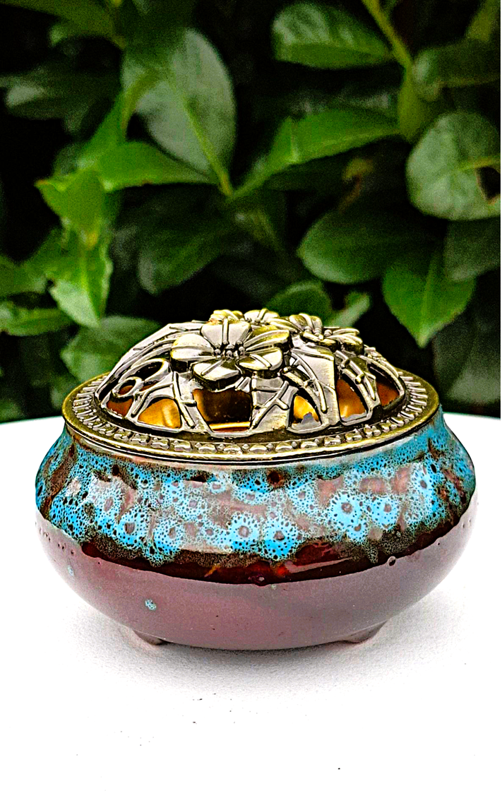 Jak relikwia z dawnych czasów, ta niska, owalna kadzielnica wykonana z ceramiki w odcieniach głębokiego brązu i morskiego błękitu kryje w sobie tajemnicę Wschodu.