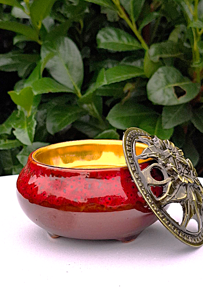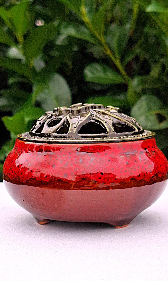 Jak relikwia z dawnych czasów, ta niska, owalna kadzielnica wykonana z ceramiki w odcieniach głębokiego brązu i czerwieni kryje w sobie tajemnicę Wschodu.