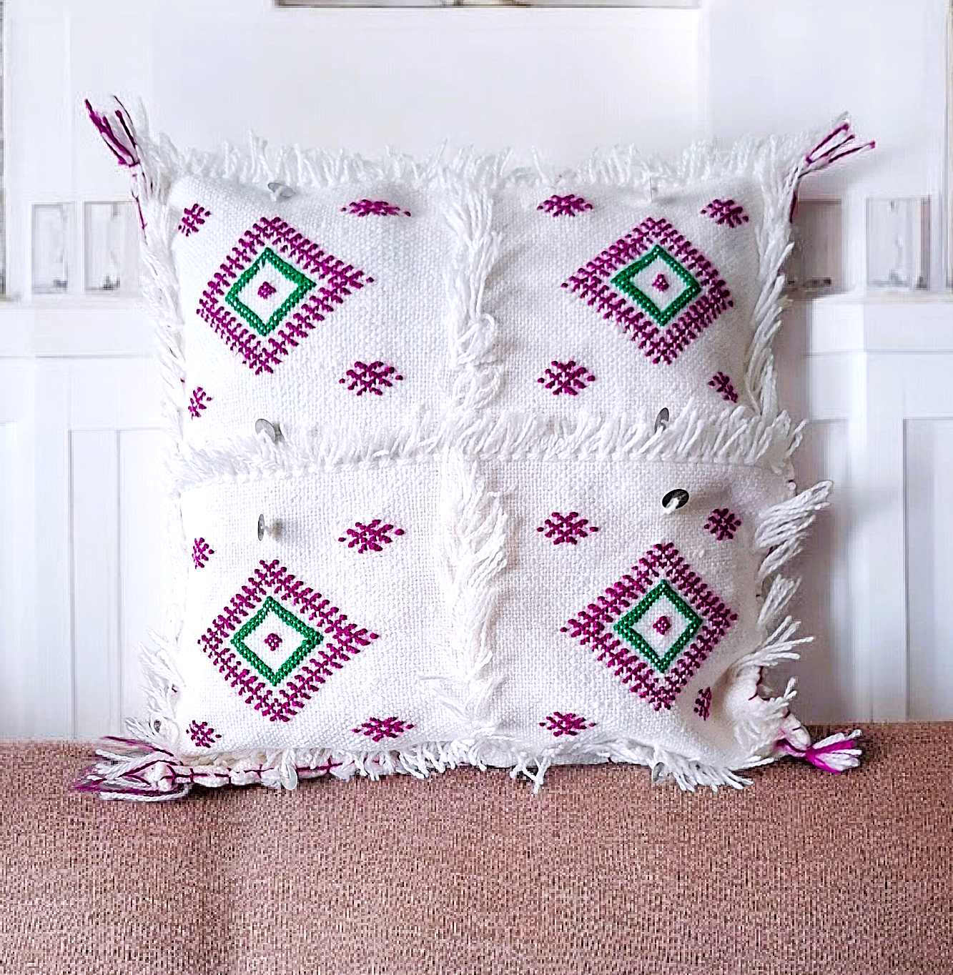 Prezentuję ręcznie tkaną poszewkę kilim z marokańskiego materiału, która stanowi oryginalny, dekoracyjny dodatek pasujący niemal w każdym wnętrzu.