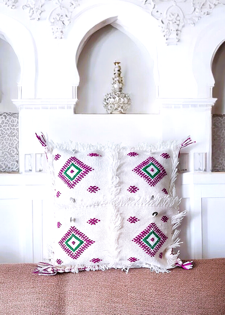 Powierzchnia poszewki pokryta jest żywymi, ręcznie haftowanymi symbolami w berberyjskim stylu.