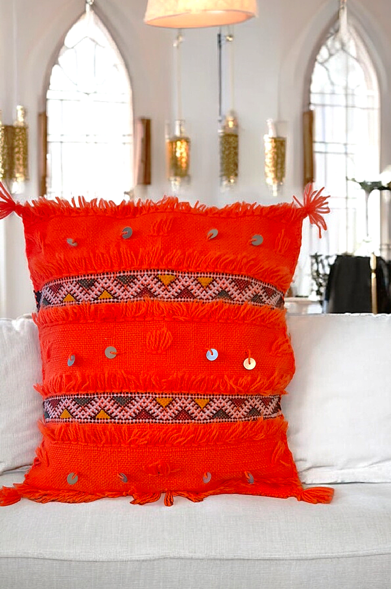 Powierzchnia poszewki pokryta jest żywymi, ręcznie haftowanymi symbolami w berberyjskim stylu.