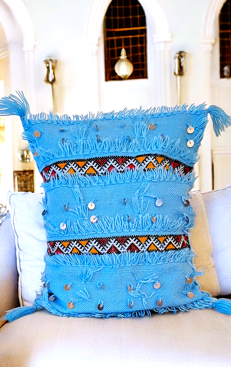 Powierzchnia poszewki pokryta jest żywymi, ręcznie haftowanymi symbolami w berberyjskim stylu.