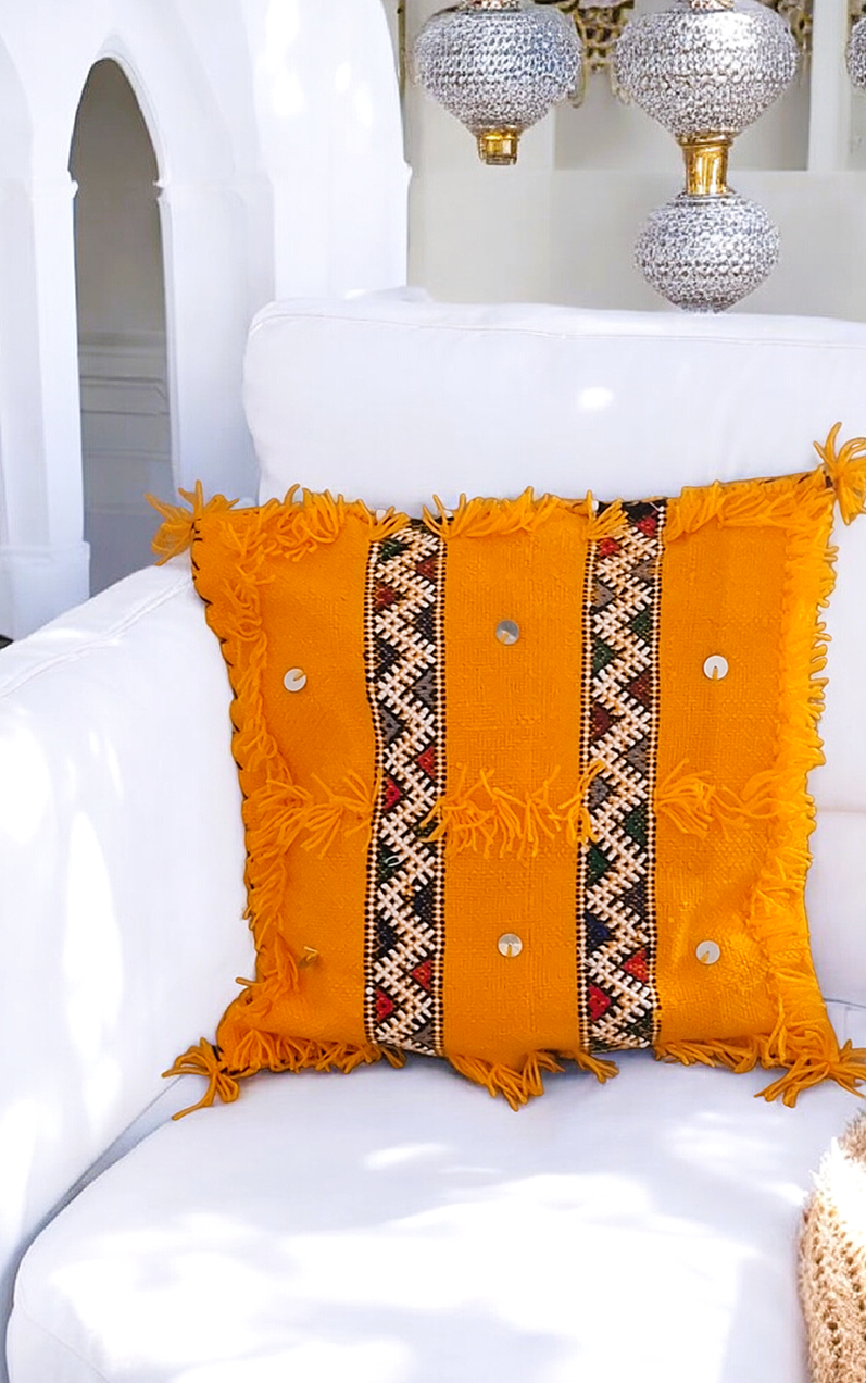Prezentuję ręcznie tkaną poszewkę kilim z marokańskiego materiału, która stanowi oryginalny, dekoracyjny dodatek pasujący niemal w każdym wnętrzu.