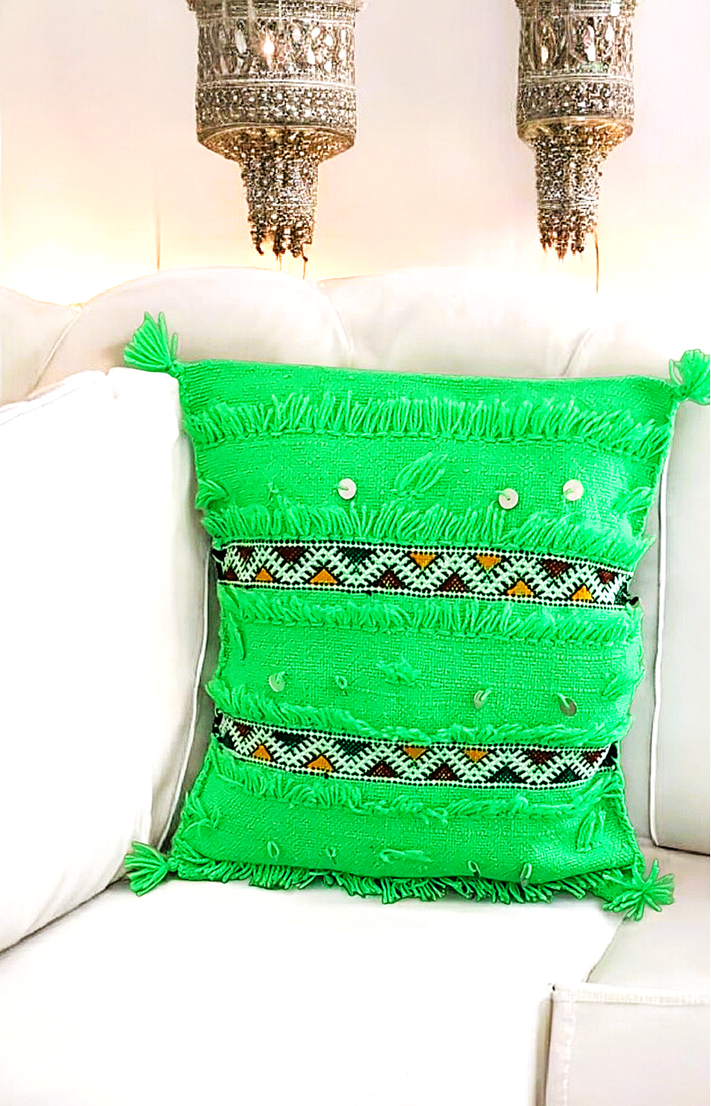 Prezentuję ręcznie tkaną poszewkę kilim z marokańskiego materiału, która stanowi oryginalny, dekoracyjny dodatek pasujący niemal w każdym wnętrzu.