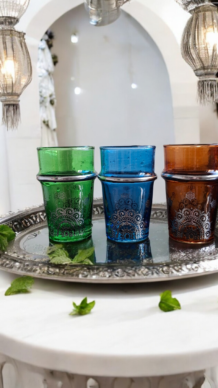 Każda szklaneczka ma inny odcień, inspirowany barwami Maroka — od głębokich, nasyconych tonów po subtelne, ciepłe kolory.