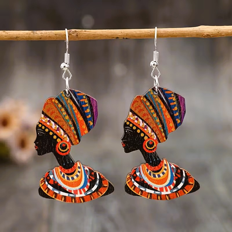 Te afrykańskie kolczyki to wyjątkowa, ręcznie wykonana biżuteria z drewna, która przyciąga wzrok bogactwem kolorów i symboliką. Kolczyki mają kształt eleganckiego profilu kobiety w tradycyjnym afrykańskim turbanie.