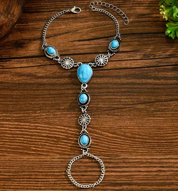 Każdy kamień to jakby kropla nieba, zamknięta w owalnej, srebrnej oprawie, zdobionej misternymi, stylizowanymi kwiatami lub słońcami. Delikatny łańcuszek oplata palec, a większy kamień w kształcie łzy spoczywa na wierzchu dłoni, stanowiąc serce tej biżuterii.